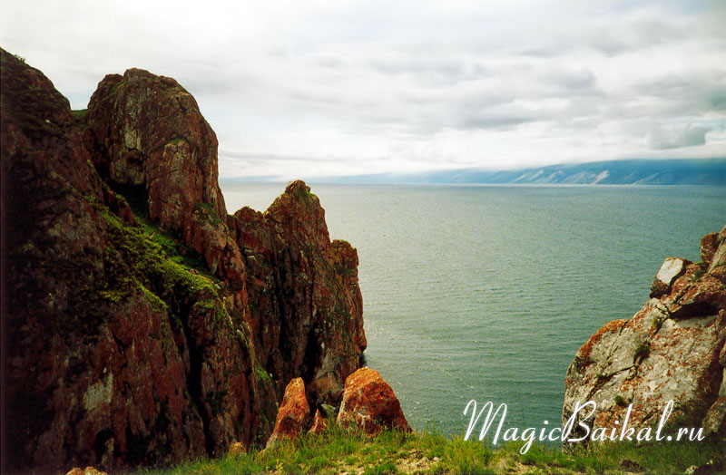 Уже с тропы открывается красивый вид на бухту. Тропа выводит на вершины мыса, альпинистских навыков здесь не требуется, главное не лезть на самый край, чтобы не свалиться вниз. По красоте, виды, открывающиеся с вершин Саган–Хушун, могут сравниться разве что с теми, что мы видели в районе Бурхана. Отсюда хорошо видна северо–восточная оконечность острова мыс Хобой, очень красиво смотрится противоположный берег Малого Моря. По–видимому, скалы сложены из того же материала, что и Бурхан и так же покрыты цветными лишайниками. Оставалось только сожалеть, что погода не позволила увидеть этой красоты снизу. Место посещаемое, но не настолько, как Бурхан. Здесь нет утрамбованных голых площадок, напротив — кругом яркая зеленая травка и много цветов.