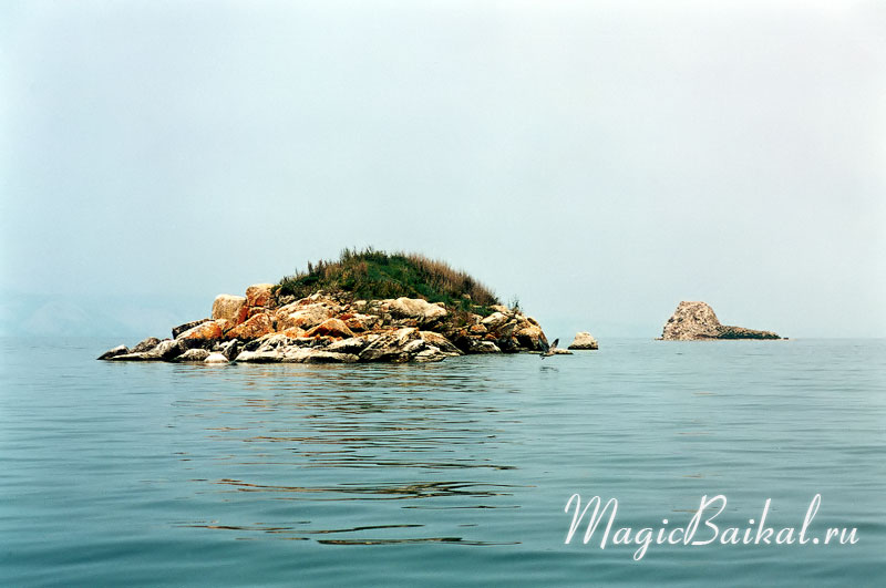 Пройдя примерно час по Малому Морю, подходим к острову Хубын, первому на нашем пути. Островок маленький и выглядит совершенно необитаемым — не видно даже птиц. Это понятно, места здесь людные, а остров находится близко к берегу Ольхона, грохочущие корабли и моторные лодки не редкость.